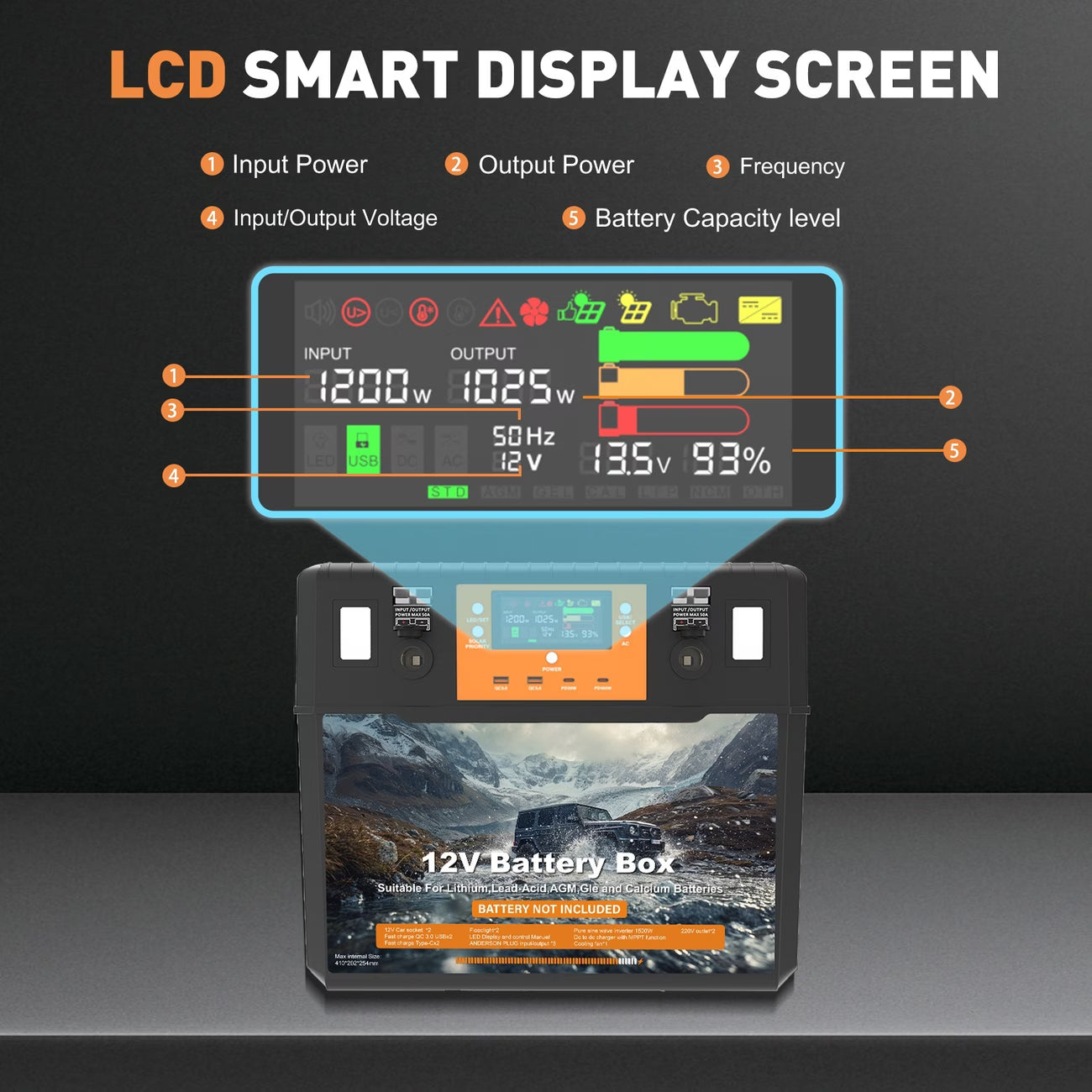 Are you an avid camper looking to enhance your outdoor experience with the convenience of electricity? Look no further! A 1500w inverter battery box is the perfect solution to power up your camping adventure. Whether you're looking to charge your electronics, run small appliances, or simply have a reliable power source during your trip, a 1200w inverter has got you covered. A 1500W Inverter Battery Box will instantly turn your AGM or Lithium Deep Cycle Battery into a portable power hub. This 12V/240V Battery Box gives you reliable power options to make your battery functional. The handy LCD screen makes it easy to see how much battery power you have left. This kit gives users a portable, reliable, durable and rugged battery box for camping adventures. With tons of essential features, the 1500W Inverter Battery Box will keep your gear running smoothly and efficiently while you relax and enjoy the camping experience. This 1500W Battery Box is a must-have for your next camping adventure, enabling you to keep your electronics charged.