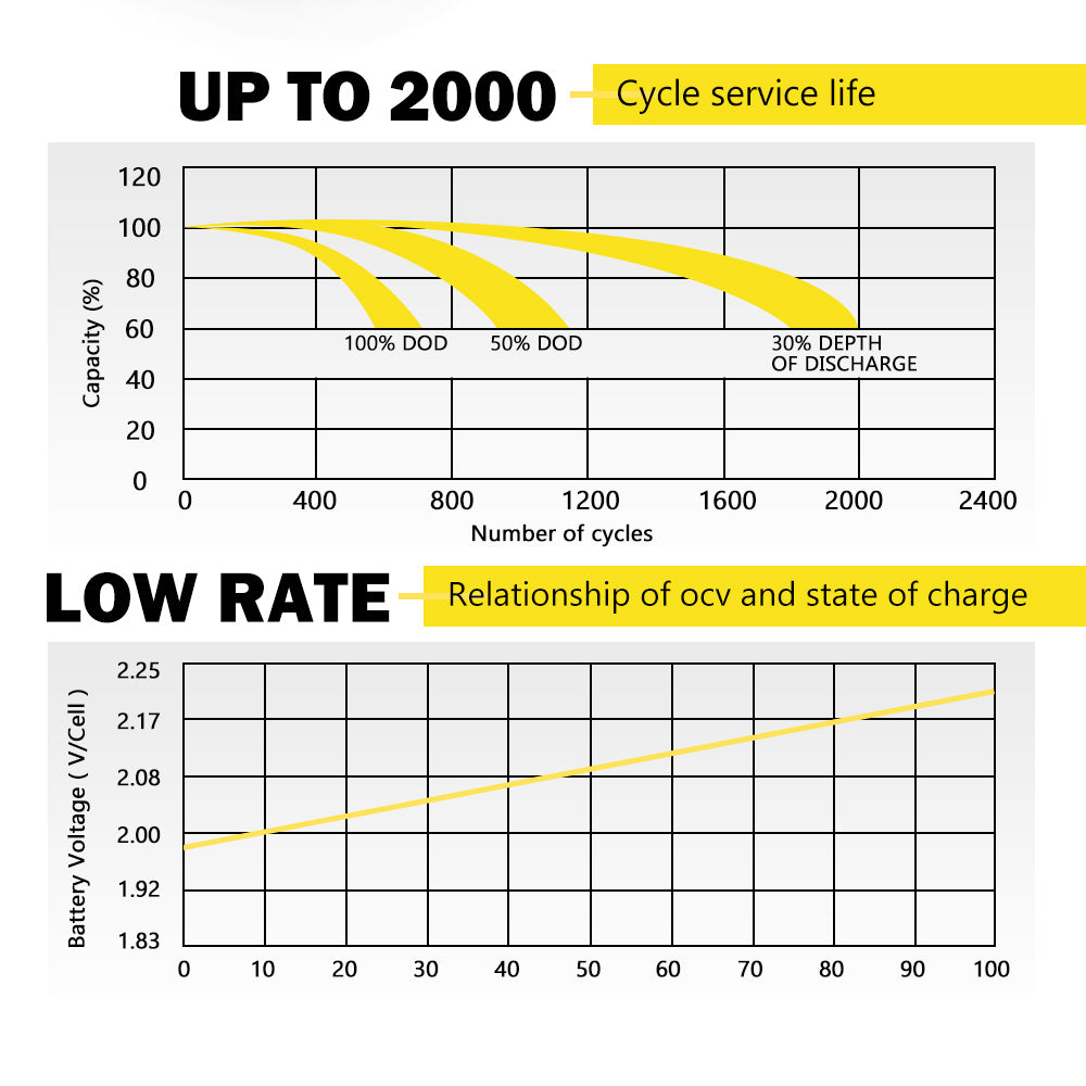 Longer life: up to 2,000 cycles (manufacturer rated) with strong deep-discharge recovery.