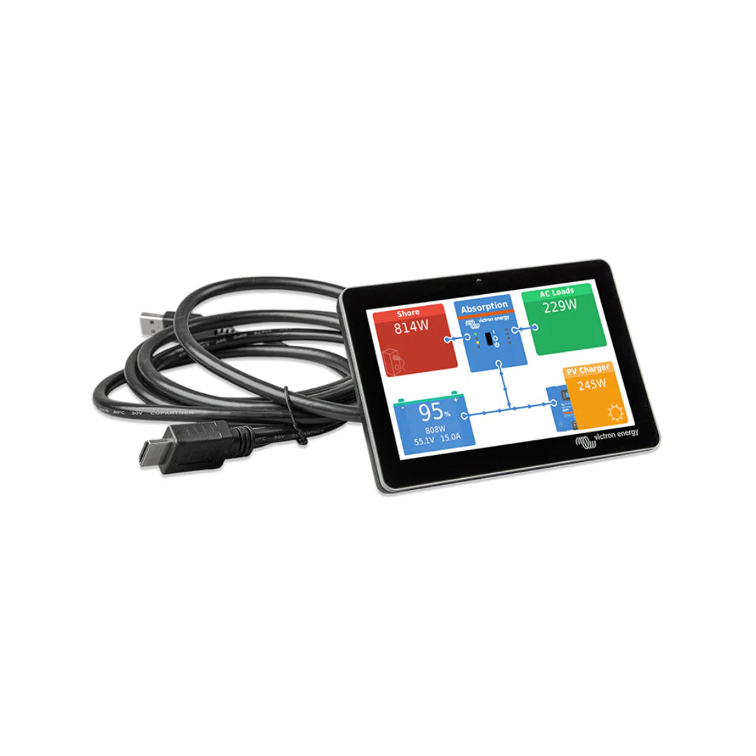 • Cerbo GX + GX Touch 50 – The “brain” and touchscreen for live power flow, SOC, solar input; enables remote monitoring via Victron VRM.