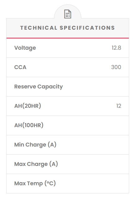 • Other powersport equipment needing a 12V ~14-18Ah AGM battery