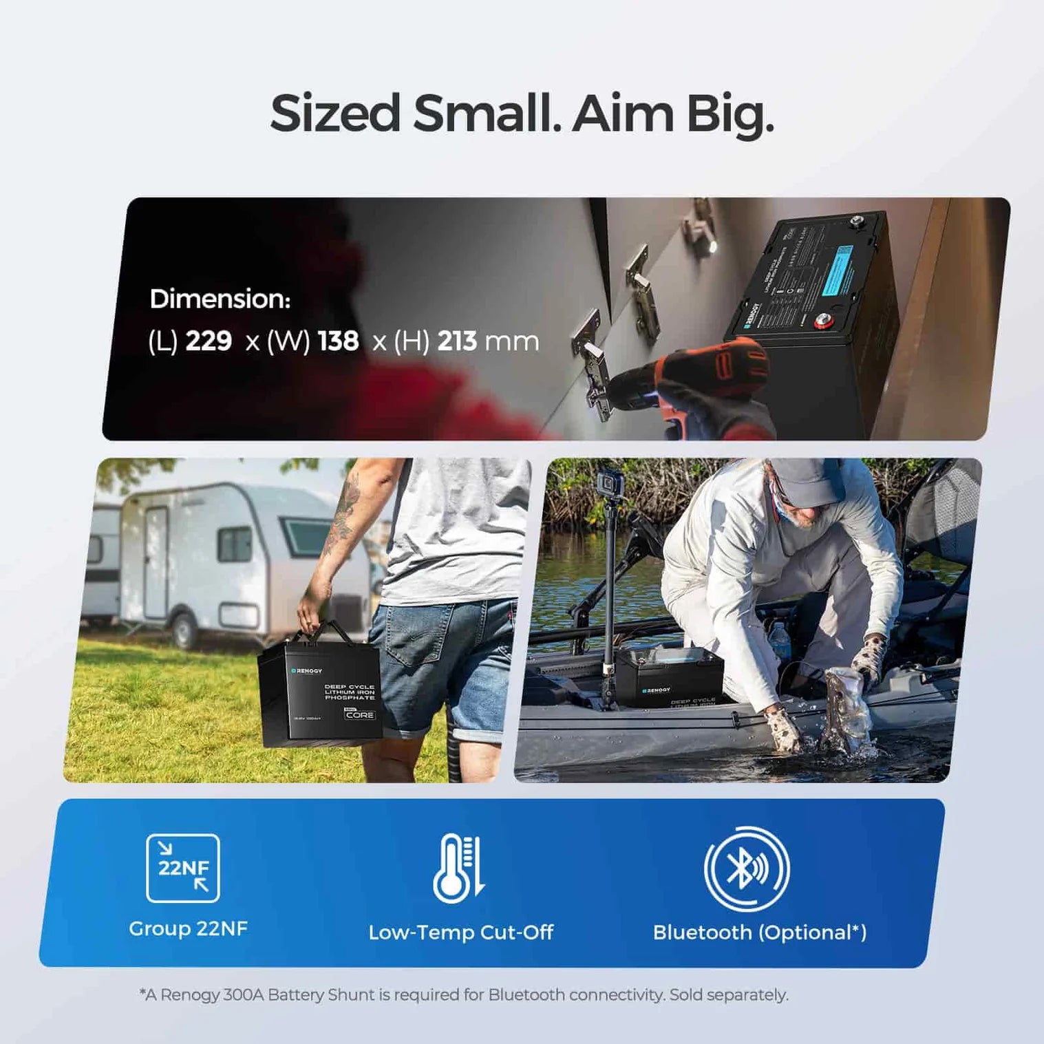 Renogy's smallest 12.8V 100Ah LiFePO₄ battery (Group 22NF footprint)