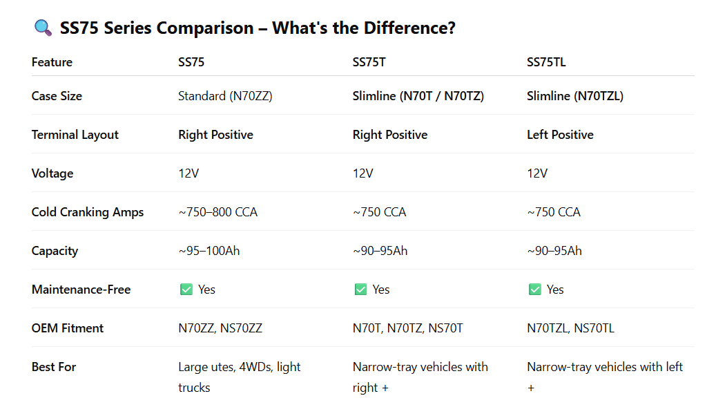 The SS75 is part of the SSB Gold MF Series, featuring advanced calcium-calcium technology for higher cold cranking amps, excellent vibration resistance, and exceptional heat durability. Built for Australia’s harsh climate, this battery is factory-sealed, spill-proof, and completely maintenance-free simply install it and drive with confidence.